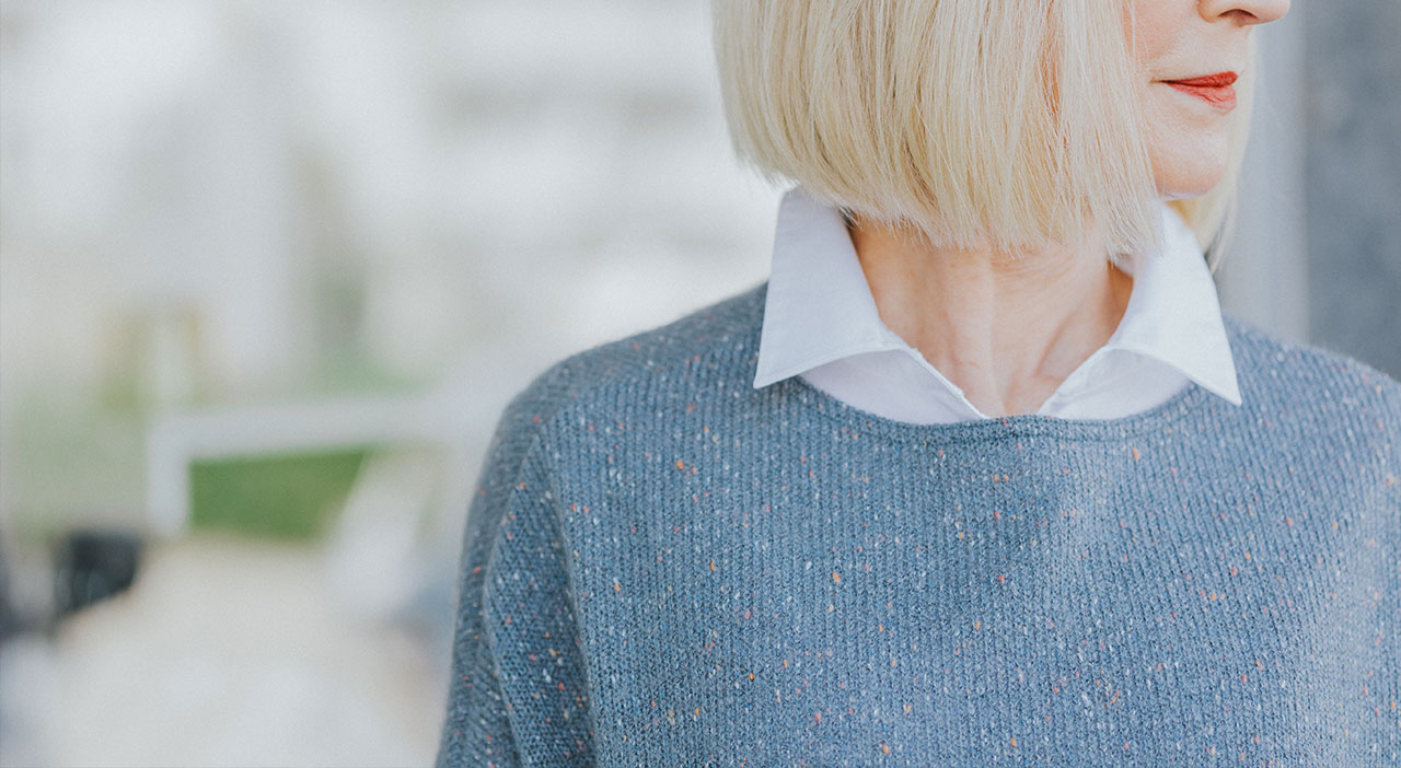 This sweater reminds us of the misty Shetland Isles full of flecks of colour and cozy weight. We love the crew neckline, drop shoulder and easy, relaxed fit. Wear it on its own or layer over the button-up. Accessorize with a great scarf or pretty necklace. Available in four fabulous colours but we have chosen blue and Grey for this collection.