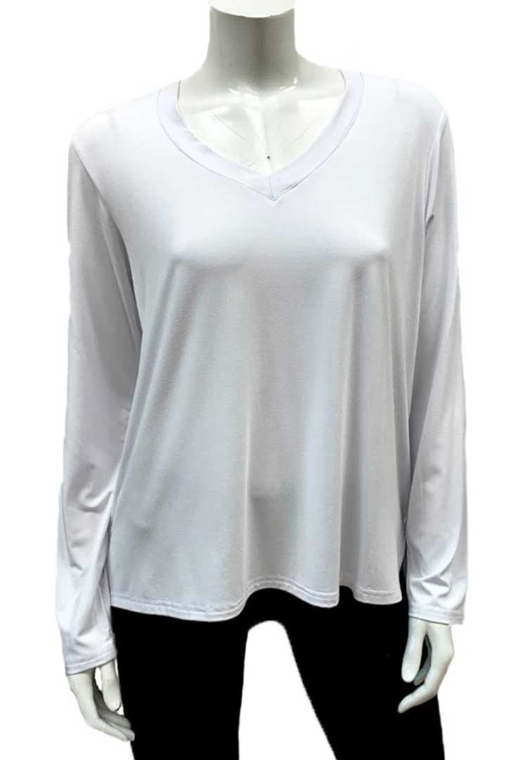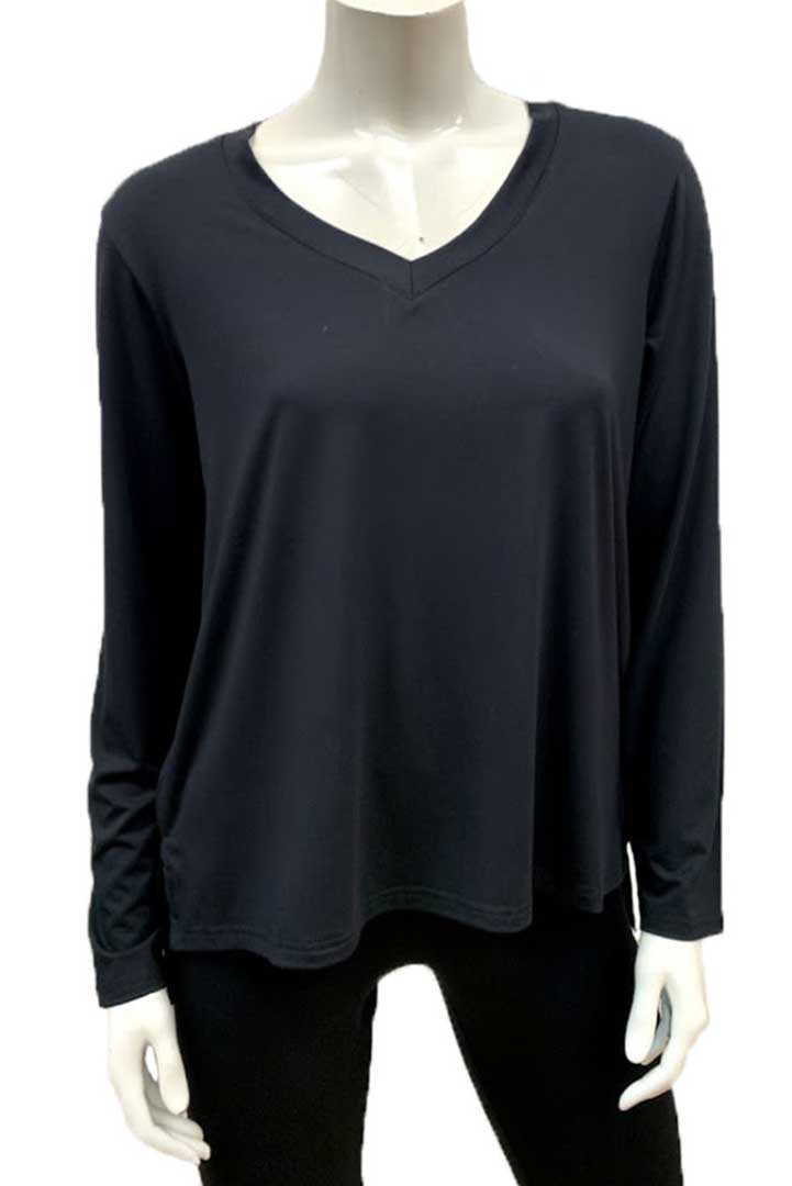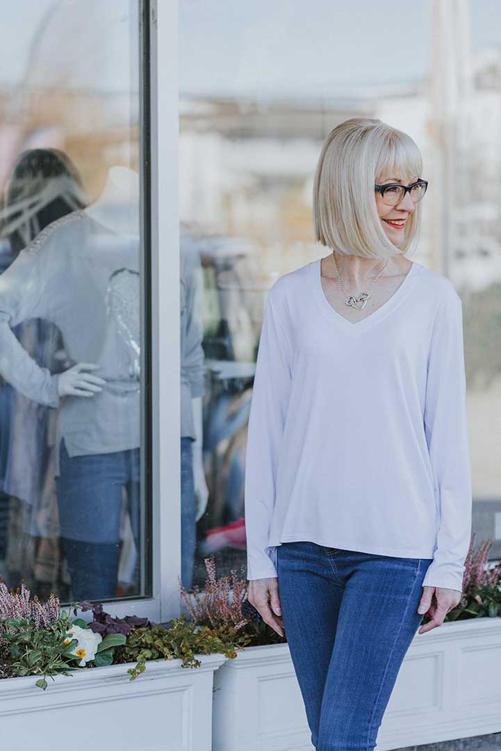 A new easy layer, this tee features a beautiful V neckline, long sleeves, a stepped hemline, and a semi-relaxed fit. Perfect for under your cozy cardigans our on its own in the warmer weather!