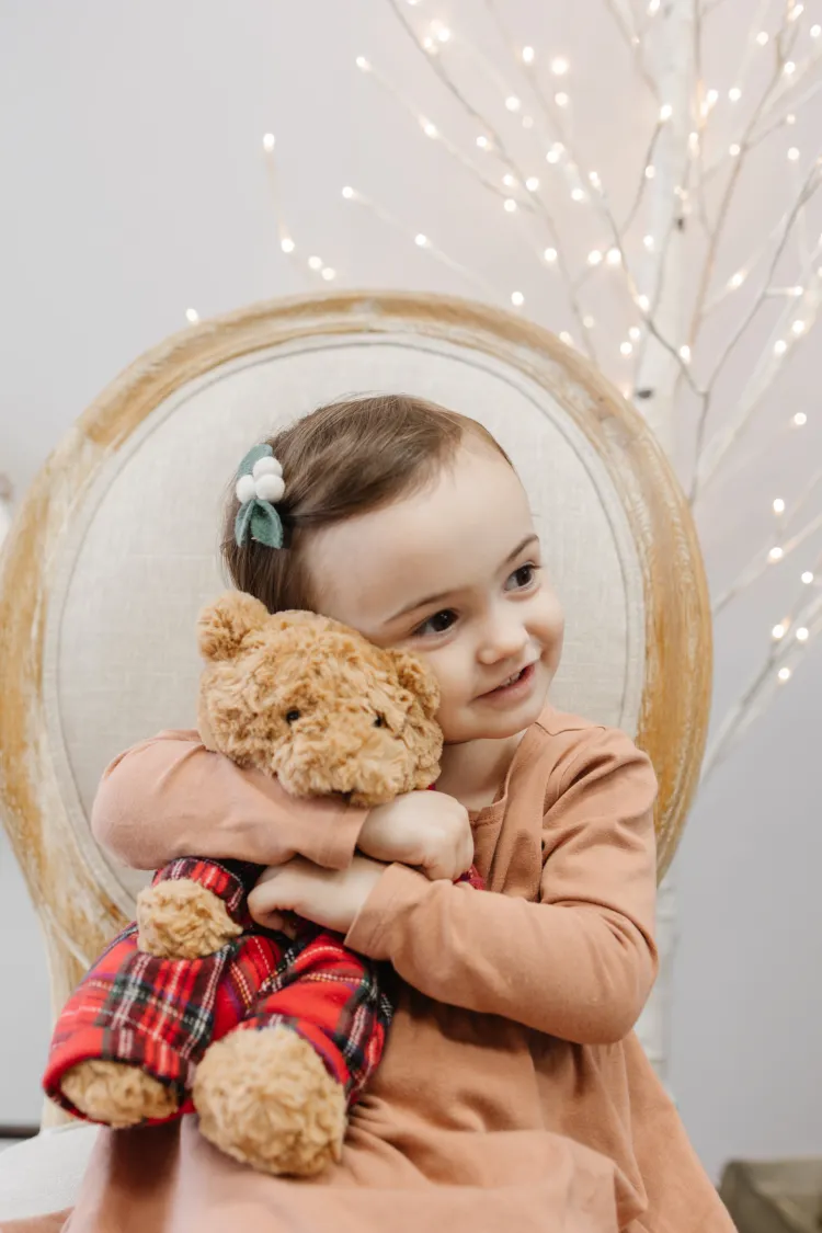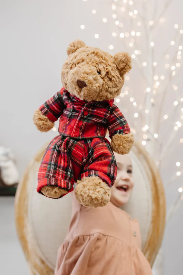 Bartholomew Bear Bedtime is ready to snooze – just look at that tousled gingerbread fur! His PJs with rolled tartan cuffs and embroidered buttons are removable. There’s even a little gap for his tail so he can hibernate in comfort!